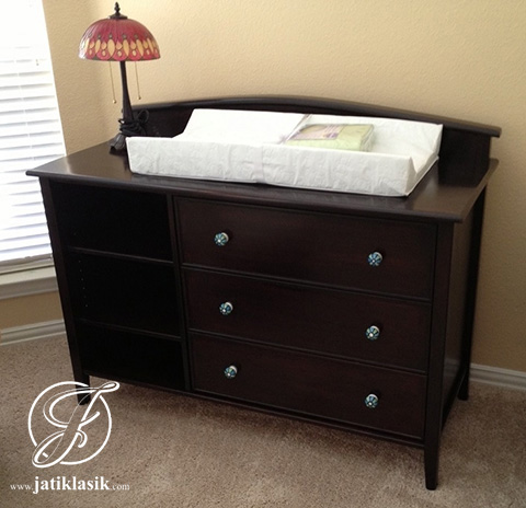 Baby Tafel Jati Minimalis Espresso Modern merupakan produk mebel anak dalam kategori perlengkapan furniture bayi modern dengan ukuran baby tafel P 120 cm x L 60 cm x T 80 cm. Bahan pembuat baby tafel mewah ini menggunakan kayu jati perhutani dengan warna salak gloss melamin yang aman untuk bayi. Desain dari baby tafel ini simpel dengan 3 laci dan 3 sorong laci. Di dukung oleh pengarajin mebel Jepara yang sudah profesional dalam bidang pembuatan furniture anak sehingga menghasilkan produk baby tafel yang awet walau di pakai bertahun-tahun. Baby tafel ini bisa membantu anda saat baru melahirkan bayi sebagai tempat menghias bayi anda yang mungil.