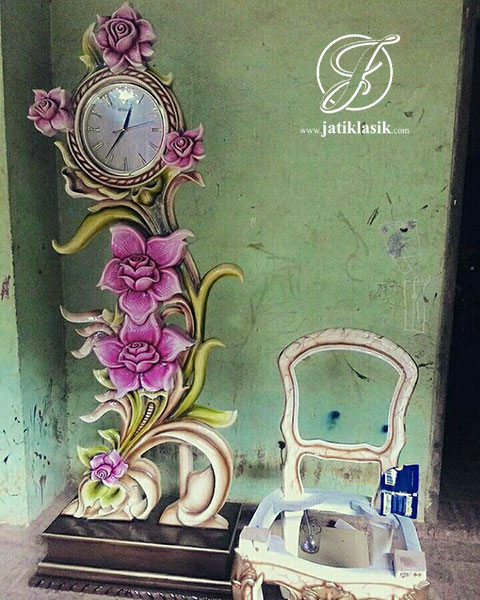 Desain Jam Berdiri Jati Ukir Mawar Merah