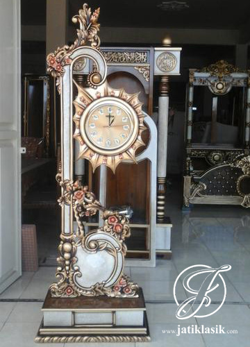 Almari Jam Hias Ukir Mawar ini merupakan produk jam hias jati khas kota ukir dari mebel Jepara, produk ini terbuat dengan menggunakan bahan baku kayu jati yang diproses oleh tangan tangan profesional di Jepara. Desain jam hias berdiri yang sangat cantik dengan pewarnaan finishing natural dan emas sangat elegan untuk anda tempatkan di rumah mewah anda. Finishing yang kami aplikasikan pada produk Lemari Jam Hias yang cantik ini, yaitu natural dengan kombinasi finishing warna gold, sangat cantik dan mewah untuk anda dapatkan. Jika anda menghendaki produk Almari Jam Hias ini untuk diganti dengan warna lain, anda bisa memilih warna yang sesuai dengan keinginan anda. Harga murah jam hias ini yang kami tawarkan kepada anda untuk sebuah produk yang cantik ini sangatlah kompetitif, sesuai dengan kualitas produk yang kami berikan. Dari desain produk, kayu jati, kontruksi pembuatan juga pewarnaan finishing yang selalu terkontrol.