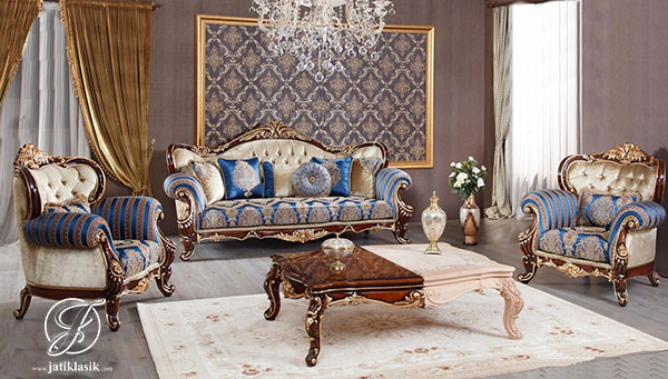 Produk sofa ruang tamu Jepara dengan desain klasik khas Eropa sangat cocok untuk mempercantik dekorasi ruang tamu klasik anda. Furniture interior klasik yang terbuat dari bahan baku kayu jati perhutani berkualitas ini dilengkapi dengan formasi dan ukuran 3 dudukan + 1 dudukan + 1 dudukan + 1 meja tamu melengkapi dekorasi ruang tamu mewah anda. Set sofa tamu Rudra Classic yang diproses langsung oleh pengrajin mebel Jati Klasik Jepara dengan balutan bahan finishing NC melamin yang sangat halus dan awet dengan bahan jok busa LJ 26 yang sangat empuk dan kenyal dengan lapisan kain jok bludru yang akan membuat ruang tamu anda sangat nyaman. Mebel custom desain sofa tamu jati klasik murah kami tawarkan sesuai dengan permintaan kualitas, jadi tidak perlu khawatir karena kami selalu mengutamakan kualitas dengan harga yang kami tawarkan minimal Grade B untuk menjamin jangka panjangnya hingga puluhan tahun.