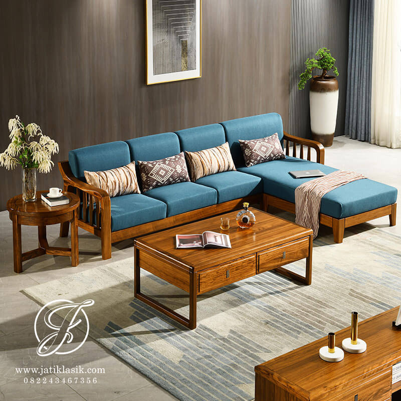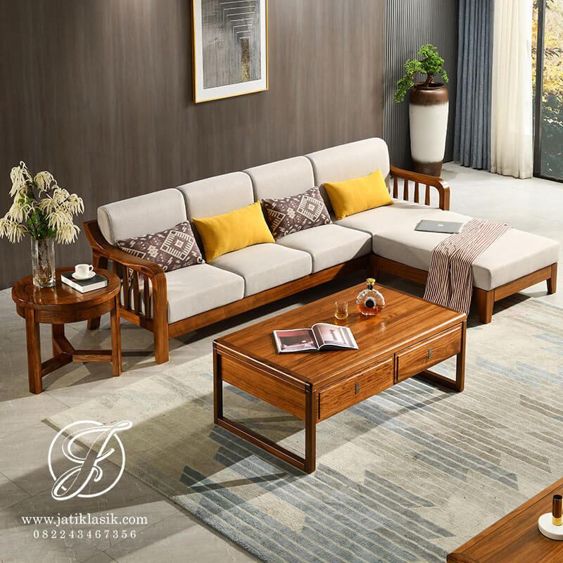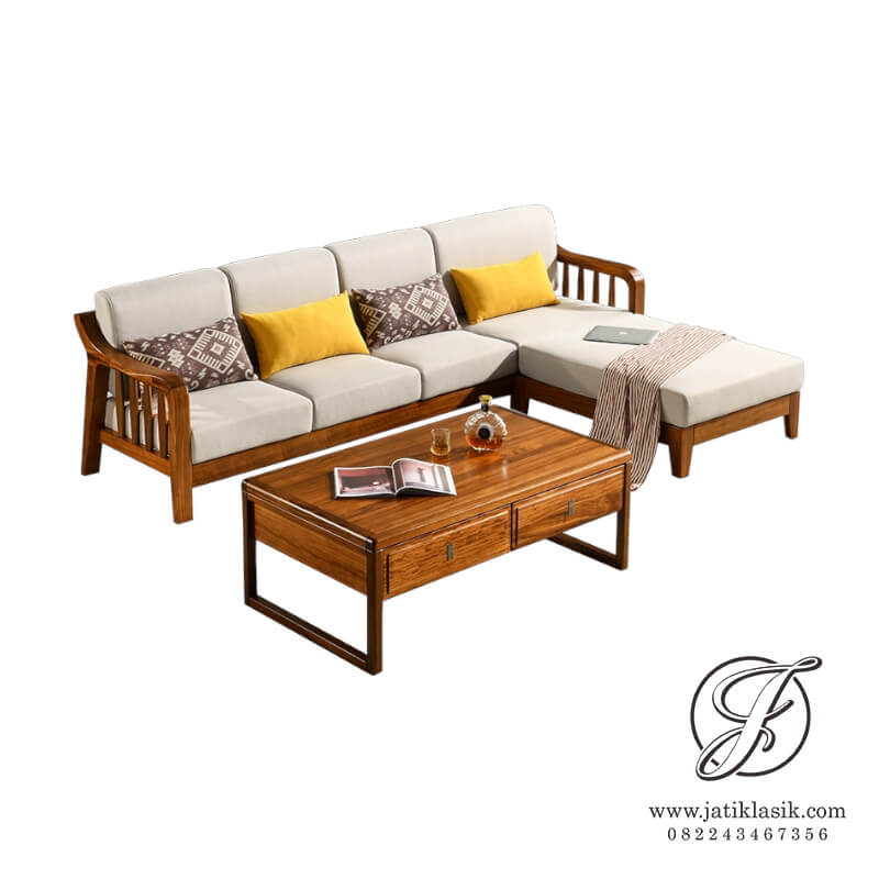 Furnitur kursi tamu minimalis L Skandinavian desain yang sangat cocok untuk interior ruang tamu minimalis modern dengan desain simpel, sederhana dan elegan. Kursi tamu modern dari bahan kursi jati Jepara dilengkapi dengan jok sofa fabric (bantalan) yang sangat empuk dan nyaman untuk singgah tamu dan keluarga. Adanya meja tamu berlaci yang bisa anda multigunakan sehingga tidak hanya membuat cantik dekorasi ruang tamu. Kursi tamu sofa letter L cukup untuk kategori ruang tamu sempit dengan ukuran panjang 2,5 meter.