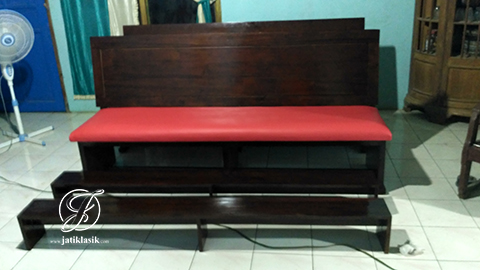 Model bangku minimalis dengan desain modern yang dibaluti dengan kain jok oscar dengan busa LJ yang sangat emouk dan kenyal meruapakan salah satu produk mebel jati Jepara dengan kualitas bahan baku kayu jati perhutani pilihan terbaik dengan pengerjaan secara detail oleh pengrajin mebel Jepara. Bangku jati mewah salah satu perabot interior gereja yang sangat dibutuh untuk dalam acara keagamaan sehingga dari segi kualitas sangat kami pertimbangkan. Ukuran bangku gereja dengan P 200 cm x L 50 cm x T 90 cm dilengkapi dengan tempat berlutut ini dapat menampung 4-5 dudukan dengan harga yang sangat kompetitif apalagi jika anda pesan untu satu ruangan penuh.