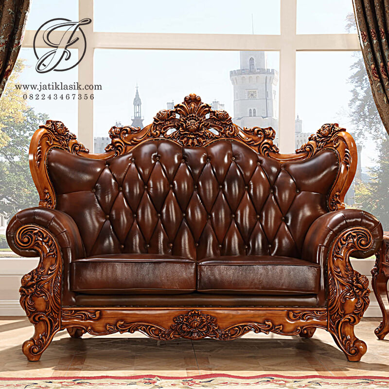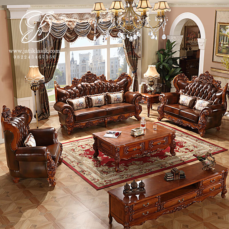 – Model Sofa Tamu Ukir Jepara Mewah Talia, kursi tamu sofa ukir menjadikan dekorasi ruang tamu rumah modern dengan gaya Eropa sangat elegan dan mewah.